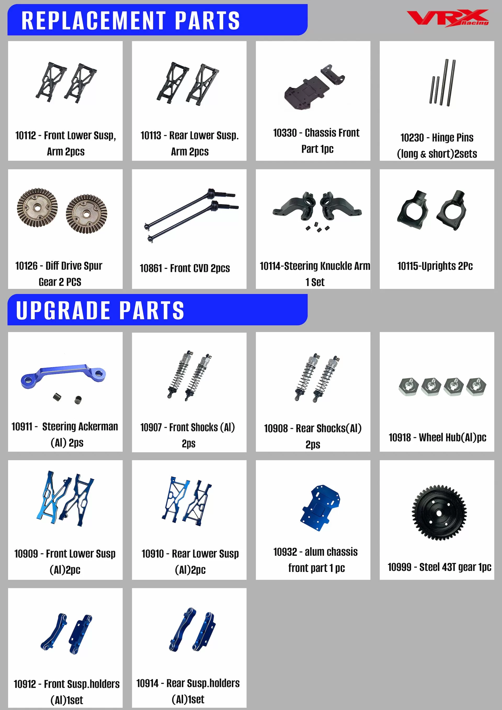 Suspension entièrement réglable, y compris, affaissement, carrossage, orteil-in, empattement etc, En réglant la suspension, les joueurs peuvent optimiser les performances de leur voiture en fonction des conditions de piste et des besoins de conduite, réglage de la suspension pour s'adapter à diverses surfaces (e.g,Pistes lisses, terrain hors route). Absorbe efficacement les chocs lors des sauts ou des terrains accidentés, protégeant le châssis et l'électronique. Optimise le contact des pneus avec le sol pour une meilleure adhérence et une meilleure traction.