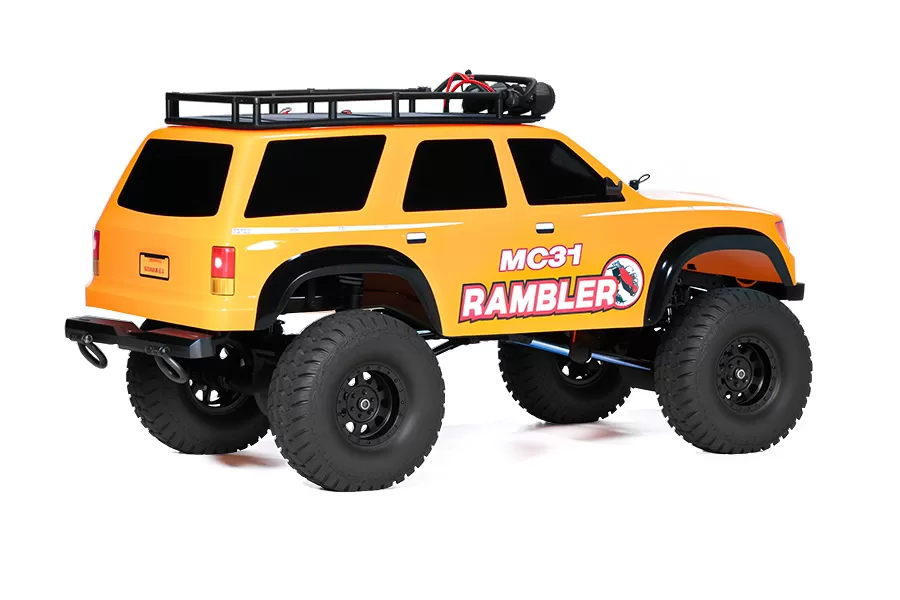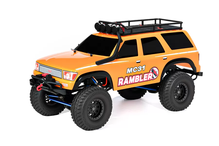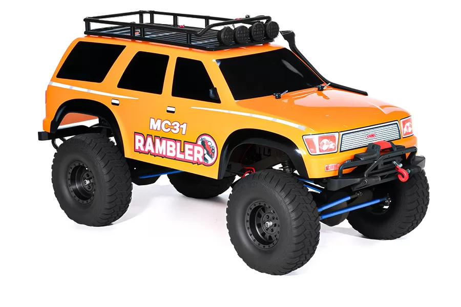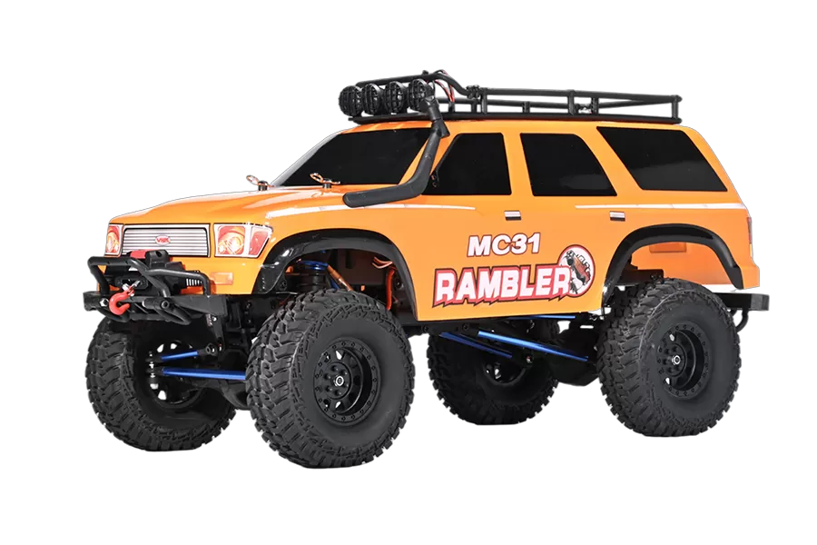 Pneus tout-terrain Supersoft avec mousse à mémoire de forme, carrosserie de style trail inspirée de l'échelle, ailes moulées, support de toit et barre lumineuse, phares et treuil inclus.